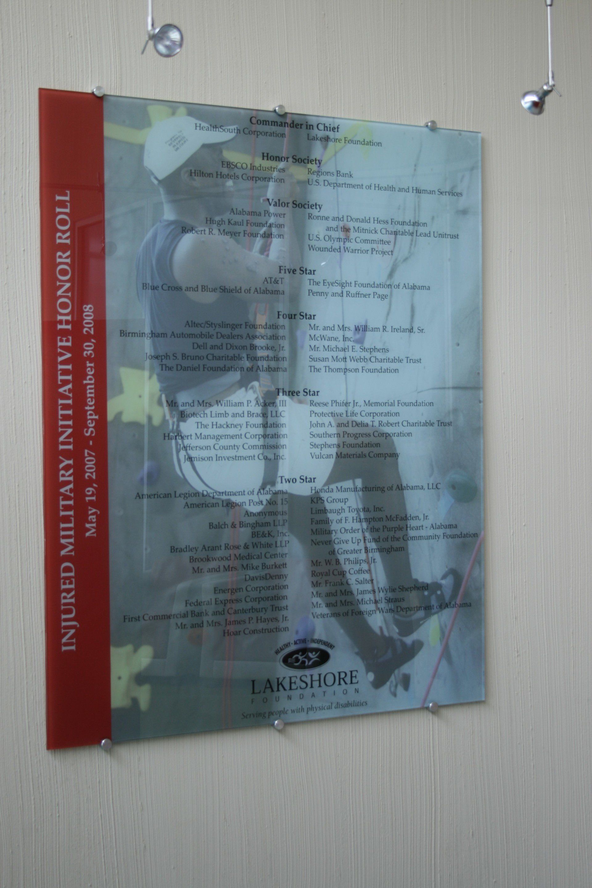 Printed Glass fund raising campaign display for Wounded Warrior barracks. Reverse-printed direct to back of tempered beveled 2” thick glass
