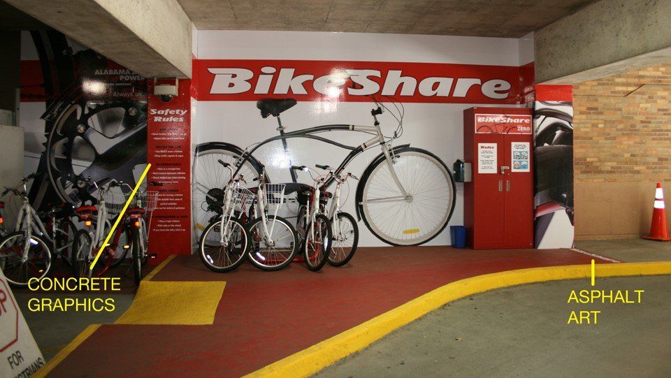 Bike Share wall mural. Covering concrete and cement in the employee parking deck.